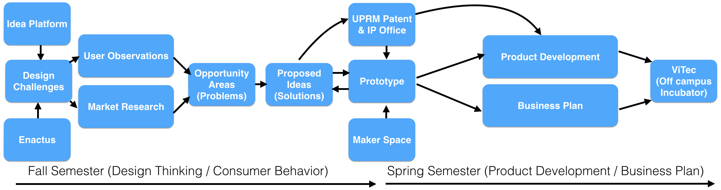 The New Venture "Briefing" The proposed project will involve students in a one-year venture working on a design challenge with support from various courses. In the first semester students take either Design Thinking, a new course that teaches human-centered-design with a project based learning approach, or Consumer Behavior, a course that teaches students about the different factors that influence consumer behavior and decision process. Each E-team will have members in at least one of the courses, as both courses will help teams work in their design challenge by conducting market research and extensive user observations. Subsequently, E-teams will present to both course instructors their identified opportunity areas (problems). After these are approved they can start to propose ideas (solutions) to prototype. In this stage, students will interact with the campus Makerspace and Patent & IP office. At the end of the first semesters each E-team will present their prototypes in a design review in which a panel of judges will decide if the team should continue to develop the product. In the second semester, the E-team members will enroll in capstone, Technology-Based Entrepreneurship, or Interdisciplinary product development course. The cap- stone course exists in all engineering disciplines on campus, in this course students work on real life problems. The Technology-Based Entrepreneurship is a business course that focus in writing a business plan for technology-based ventures. Finally, the course Interdisciplinary Product Development will be developed as a course similar to capstone, with the interdisciplinary element that students of all faculties can enroll. At the end of the one-year experience E-teams will have the opportunity to continue working at Vitec, an off-campus incubator.
